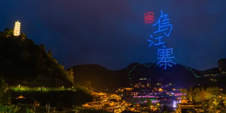 景區內能夠欣賞到各色精彩的演出。有一葦渡江的獨竹漂,划動江水圓你一場武俠夢;有絢爛多彩的烏江星音樂水舞秀,與夜幕之中無人機燈光秀交相輝映,美不勝收;還有狂歡肆意的篝火晚會,極具特色的民俗巡演……這裡,是永不打烊的理想遊樂園。