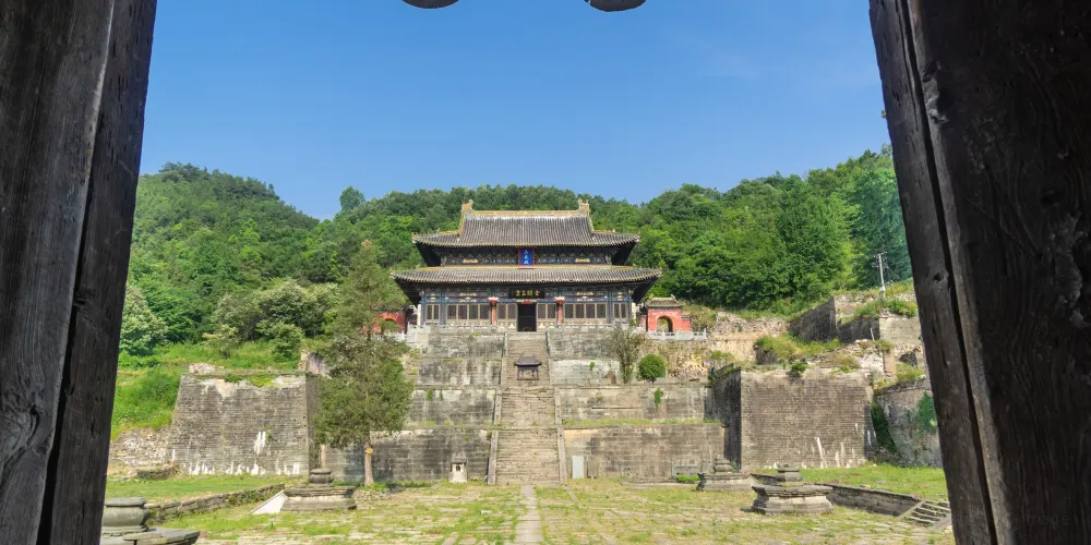 當你從陡峭曲折的古道經過南天門,來到南巖宮大殿(玄帝殿)時,會覺眼前豁然開朗,腳下是深不可測的黑虎澗,向前方望去,武當山的主峰——天柱峰在眾山環擁中,滿目青山,雲霧繚繞,會產生飄飄欲仙的感覺。