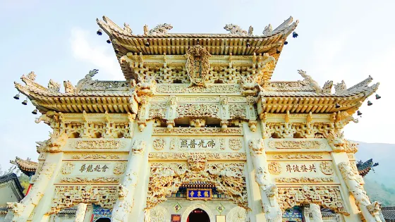 登上台階,山門前就是一座三門四柱的石牌坊,牌坊全部用漢白玉鏤空雕造而成,上面雕滿了飛龍、寶境、玉壺等圖案,玲瓏剔透,工藝之精令人歎為觀止。這座牌坊前後整整花了10年時間,是近代石雕藝術中的珍品。