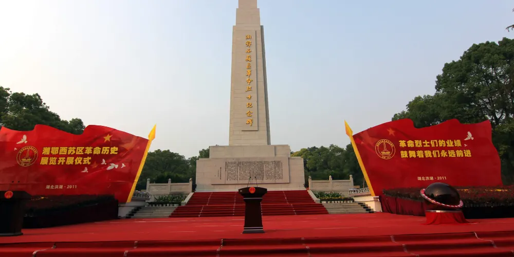 洪湖湘鄂西蘇區革命烈士紀念館,位於湘鄂兩省交界處的洪湖市新堤鎮西南部,南臨長江,北望洪湖,雄偉肅穆。 全館面積三百五十畝,主體建築包括紀念牌、烈士祠、展示館等,為「全國重點烈士建築保護單位」。