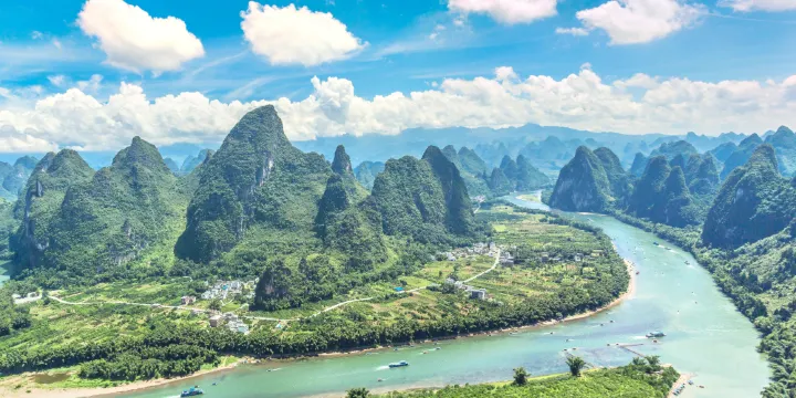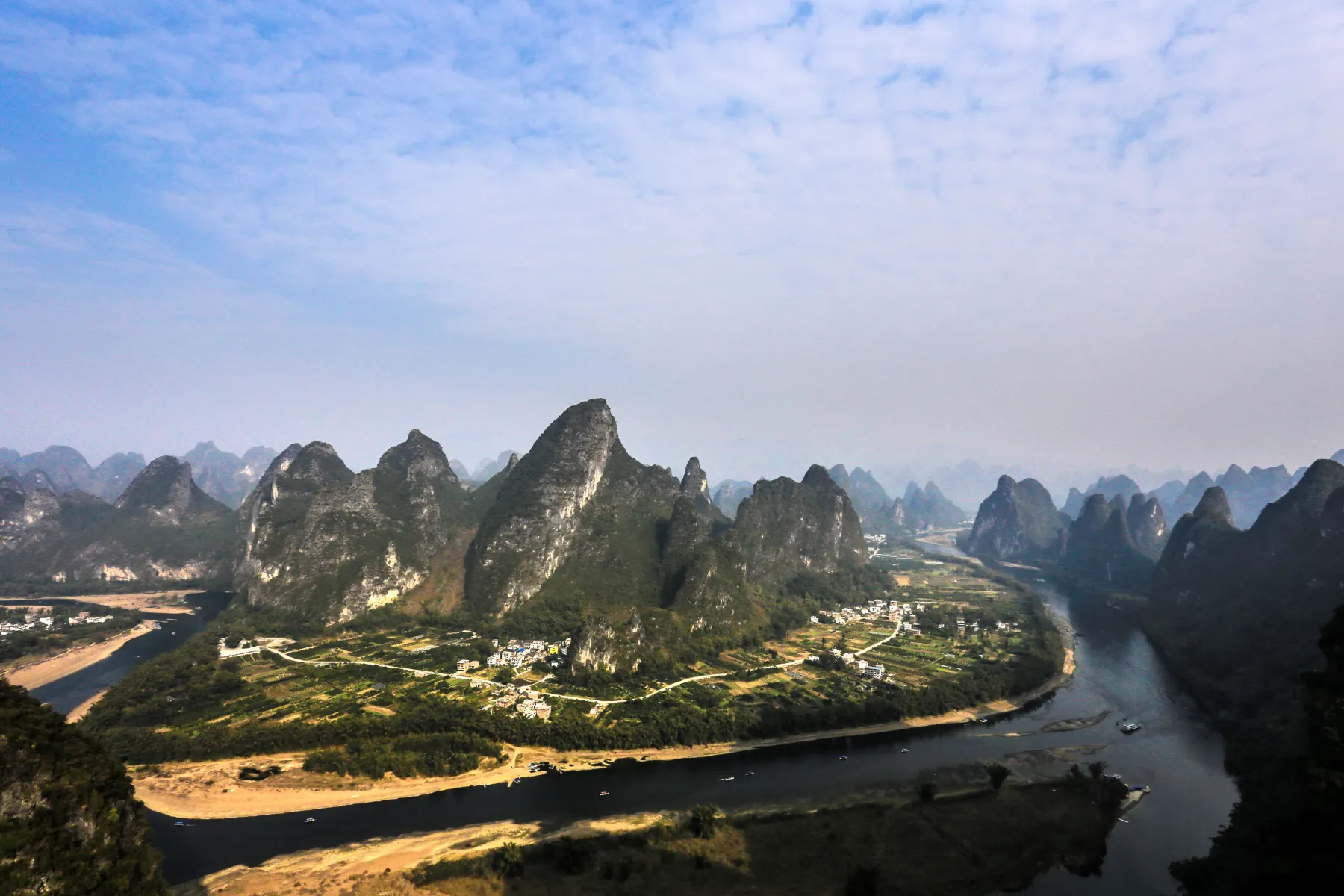 登上相公山舉目遠眺,一座座如石筍般聳立的山峰盡收眼底,清澈的漓江在群峰中蜿蜒流淌,形成一個大大的彎鉤,在晨霧繚繞中,如同水墨畫中清亮的神來一筆!
