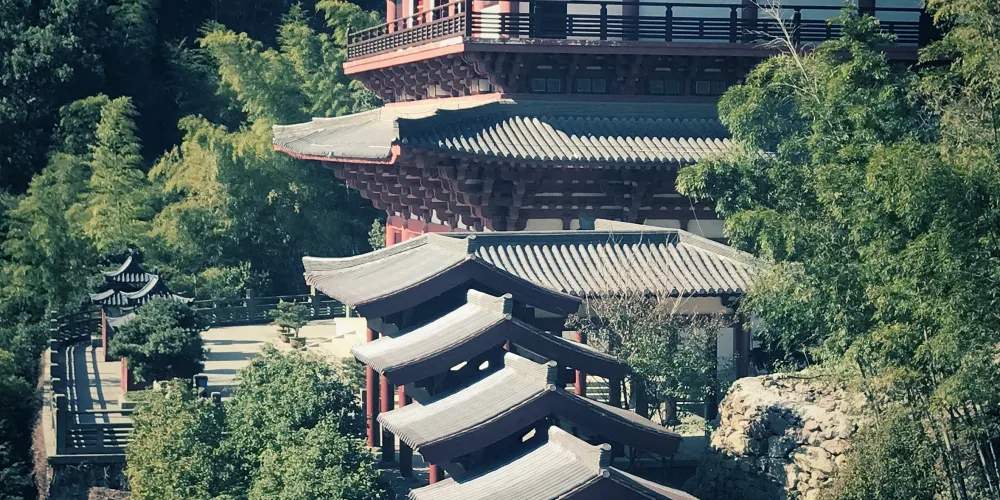遊玩過後,在此乘觀光車去往西邊的香山教寺和九龍源。香山教寺在半山腰上,背靠着達蓬山,面對九龍湖,寺院本身已有上千年的歷史。不過如今看到的建築是近年重修的,比較氣派。寺院遊人不多,圓通殿前可以燒香祈福。