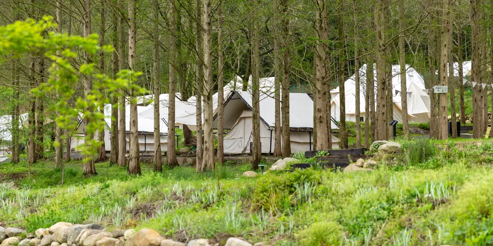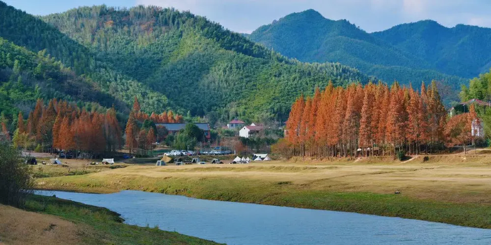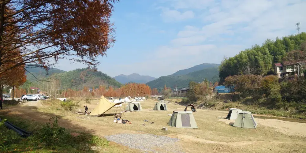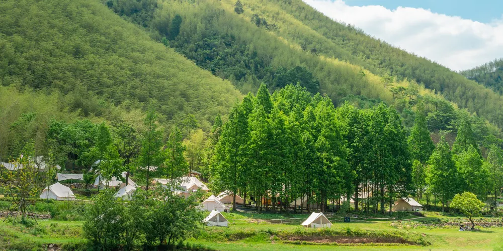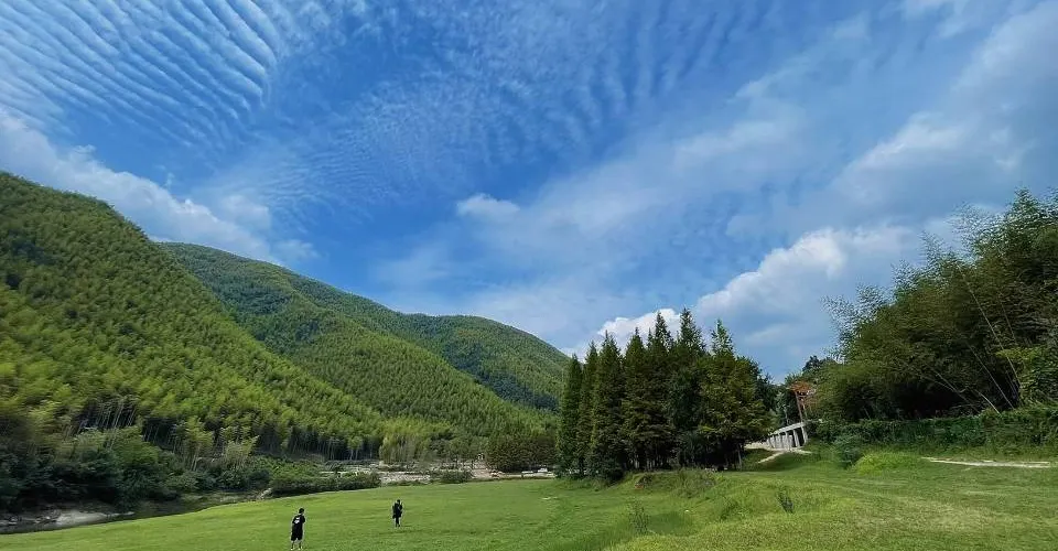小杭坑位於江浙滬交界處,地理位置優越。這裡群山環繞,形成了一片得天獨厚的自然景觀。遊客可以站在觀景平台上,俯瞰其整個壯麗景色,感受大自然的神奇魅力。這裡的天空湛藍,雲彩潔白,山水碧綠,彷彿是大自然與生活融合的詮釋。這裡有三個露營基地,為露營愛好者提供了豐富的選擇。