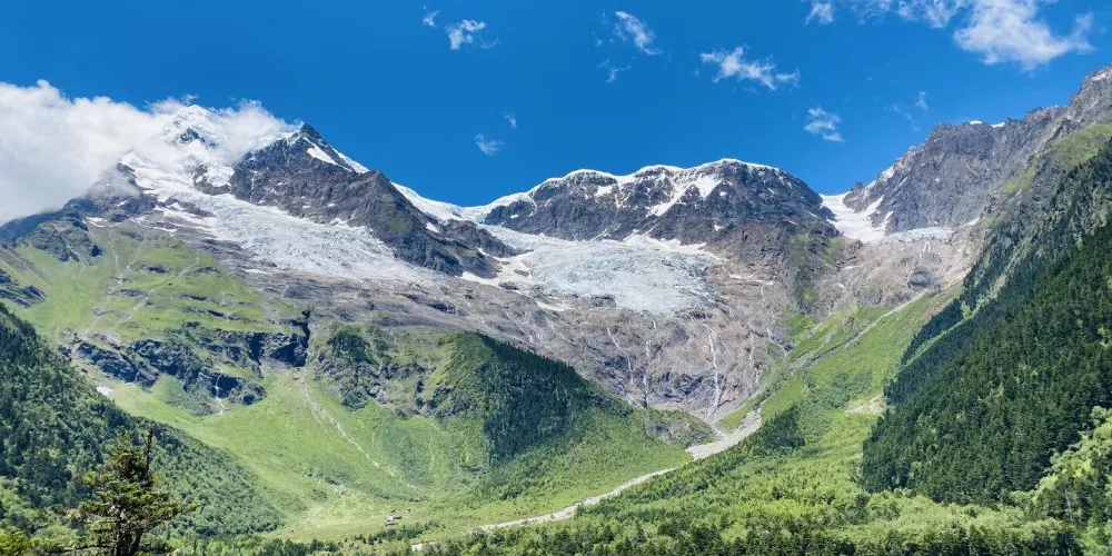 冰湖是由冰川融水構成。從大本營出發,沿著狹窄陡峭的小路一路攀升,約一小時可達冰湖。站在冰湖旁邊的小山坡上,碧綠的湖水倒映著藍天白雲,在周圍白色雪峰的映襯下,平靜安詳。冰湖旁邊原有兩個小小的冰堆,是山上多年冰崩形成,近幾年隨著天氣變暖遊人增多,已經慢慢消融,不複往昔之壯美,但仍不失其祥和。