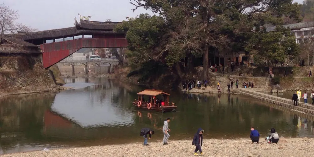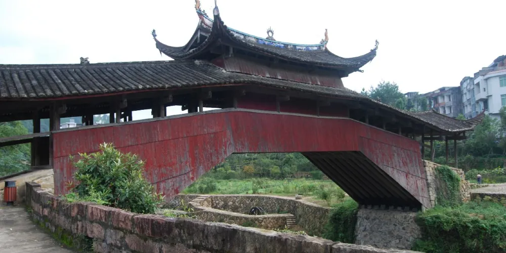 溪東橋位於泗溪鎮,因橫跨鎮內東溪之上而得名。此橋建於明隆慶四年(1570),清乾隆十年(1745)重表,道光七年重修。整個橋長41.7米,寬4.86米,高10.35米,橋屋15間,中央三間是宮殿式主樓,構架飛檐翹角。橋棟上麪塑造“螯魚雙吐水”,棟下塑造“唐僧取經”及梅、蘭、竹、菊等諸多工藝,形態栩栩如生。橋頭飛挑,頗有吞雲吐霧之勢。橋面檐下,三間藻井,構造工藝精緻古樸,使橋身顯得更加秀麗堂皇。橋下溪水清澈,橋的另一側是一抹遠山,近處有兩座高山,獅子縫與將軍峯。據當地人講,此橋與其周圍環境形成了“將軍逗獅”的風水模式。紅色的橋身映襯在青山碧水中,更顯輕靈秀美。
