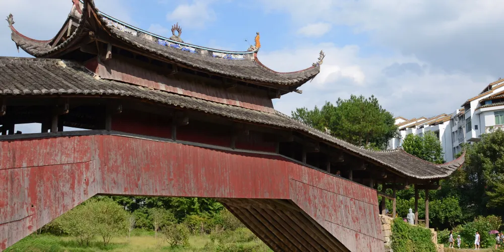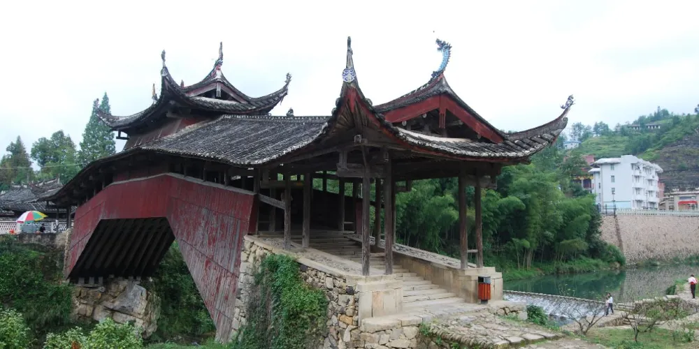 則評價南陽橋又稱玉巖橋,位於泗溪鎮巖頭村。此橋為伸臂梁木平橋,重檐歇山頂,建於同治九年。南陽橋的構造特點是在溪中建石墩,然後在石墩上疊架木樑,向左右平衡伸展。這種雙向伸臂木樑橋可以增加木樑的承託作用,同時還可使木柱在縱向有一定的穩定性。浙江山區很多木橋都採用這種構造。