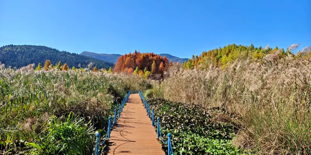 昆明西華濕地公園建在滇池西岸、高海公路中段、觀音山腳下,這裏蘆葦重重、棧道通幽、湖光山色、風影波動。8月時節,公園裡的桂花散發出陣陣幽香。西華濕地公園面積約781畝,修築景觀棧道447米,車行道1800米,其中281畝的生態濕地中,種植苗木45萬株,種植喬木1225株,還有25萬多叢水生植物,是一個結合了喬、灌、草立體結構的濕地森林公園。西華濕地公園歷來被稱為西山的後花園,儘可能地保持原有環境,就連棧道旁的野草也儘量讓其自然生長。濕地風景保留着大自然樸實的風格,沒有宂餘的枝條,也沒有園林的整齊,有的衹是原生態的淳樸,行走在公園裡還不時能聞到八月桂散發出的陣陣幽香,沁人心脾。遊客個個神清氣爽,呼吸着新鮮空氣,享受着秋初的陽光,彷彿能拋下一切煩心瑣事。