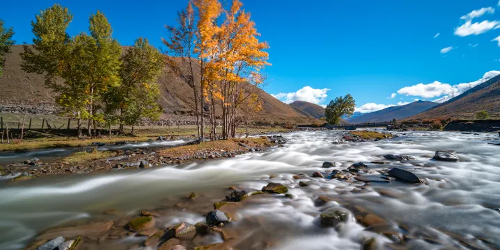 甘孜州的新都橋,位於川藏線318國道上,這裡景色優美,號稱“攝影家的天堂”。每一個來到新都橋的遊客,都會被眼前美麗的景色所震撼。這裡有高原的草甸、清澈的河流,遠處的山坡上有大片吃草的牛羊,還有散落在各處的藏族村寨。每年春季,這裡的樹葉變得金黃,是一年中最為美麗的時光。