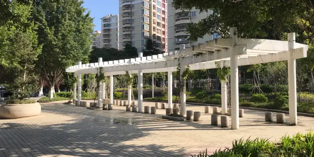 公園內的人工小山遍植大葉紫薇、金鳳、垂柳等喬灌木。園內的小徑鬥轉蛇行,小徑及眾多的花壇鋪上彩色的地錦磚和大理石,顯得亮麗迷人;涼亭、花架、花壇點綴於園區內,布局合理協調,是東區居民遊玩休閑的好去處。