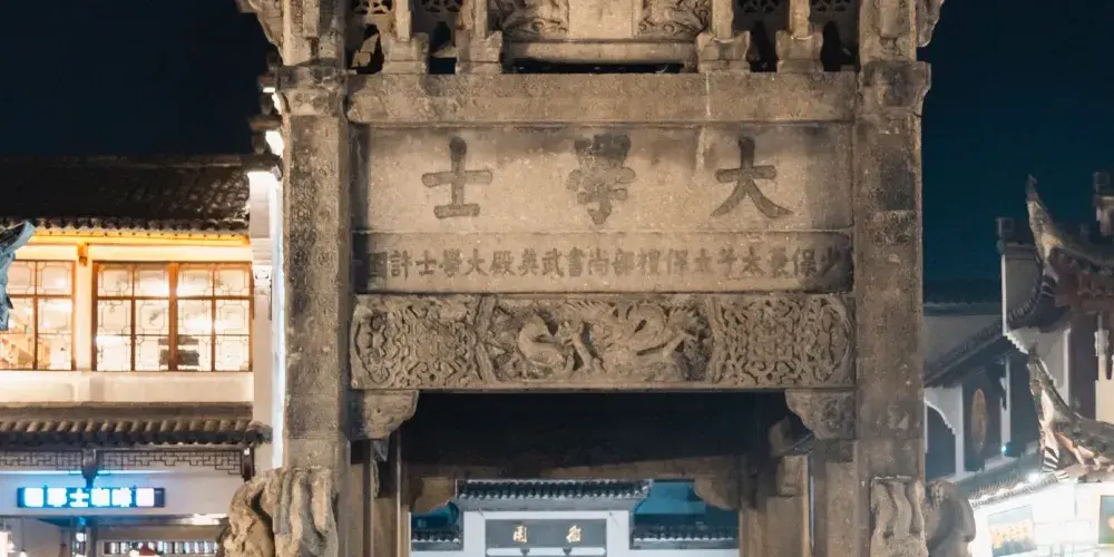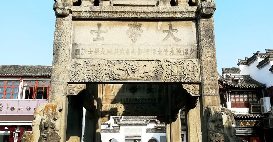 在石坊的前後左右都有題籤攜刻。前後兩面的頂層和側面的第三層,正中鑲嵌著雙龍盤邊的匾額,上面直書“恩榮”兩字,這是表明皇帝賜予的“恩典”和“榮光”;底層四面額坊上分別鐫刻著端端正正的“大學士”三個字;前後兩面小坊上署有“少保兼太子太保禮部尚書武英殿大學士許國”這一全幅頭銜;前後兩面的第二層枋上名為“先學後臣”、“上台元老”鬥大楷書刻字。“先學後臣”是宣揚許國憑文才而登上仕途的。“上台元老”,“上台”即“三台”之一。“三台”本來是星象的名稱,而古人常用以象徵“三公”(太師、太傅、太保)、“三孤”(少師、少傅、少保)。許國此是已晉少保兼太子太保,居位輔臣,名列三孤,故有此稱。