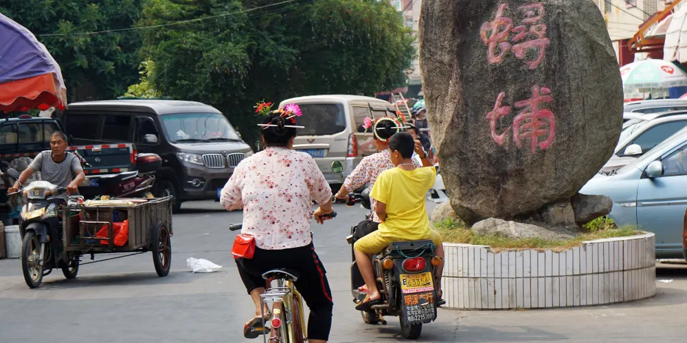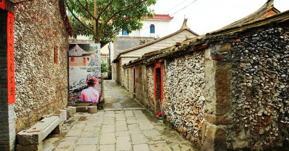 蟳埔村位於福建省泉州市豐澤區東海社區的一條小漁村,這里居住的是古時阿拉伯人的後裔,雖經歷代與當地漢族通婚,但中亞的遺風尚存,主要表現在蠔殼房和蟳埔女的頭飾上。蟳埔女盤頭插花,戴著丁香耳墜,穿著大裾衫、寬腳褲,形成了一道獨特的風情。蟳埔女“戴簪花圈,插象牙筷”的頭飾是宋代以來從中亞流傳過來的。
