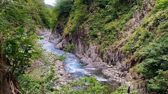 清津峽是日本三大溪谷之一。其陡峭的柱狀紋理十分美麗,與清津川湍急的河流和岩壁的嶙峋相稱,形成了一道雄偉的風景線。溪谷隧道建成後,可以在瞭望台欣賞其壯麗之姿。峽谷全長約12公里,由八萬年前的火山活動形成,兩岸玄武岩峭壁高達百米,氣勢磅礴。1996年開通的750米觀光隧道內設4處觀景台,終點「光洞」的水鏡倒影將峽谷奇景幻化為夢幻畫卷,四季皆景:春櫻點綴岩壁,夏綠浸染深潭,秋楓似火,冬雪覆崖。