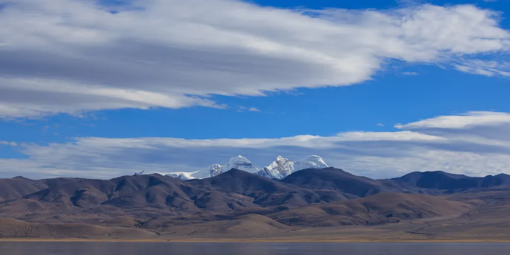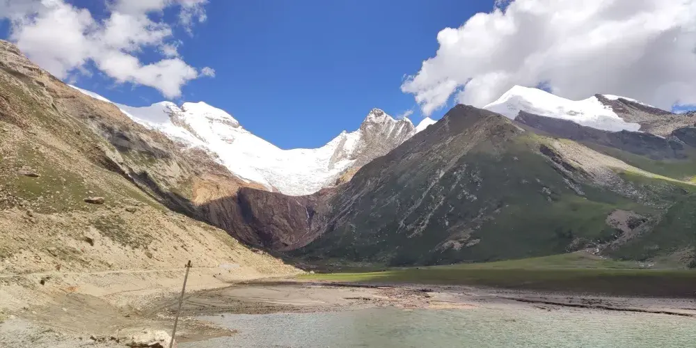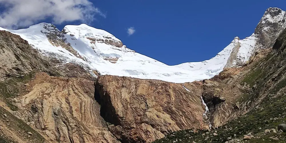 雅拉香布神山海拔數千米,山體是黑巖與白雪交錯分佈,陡峻近乎垂直。
