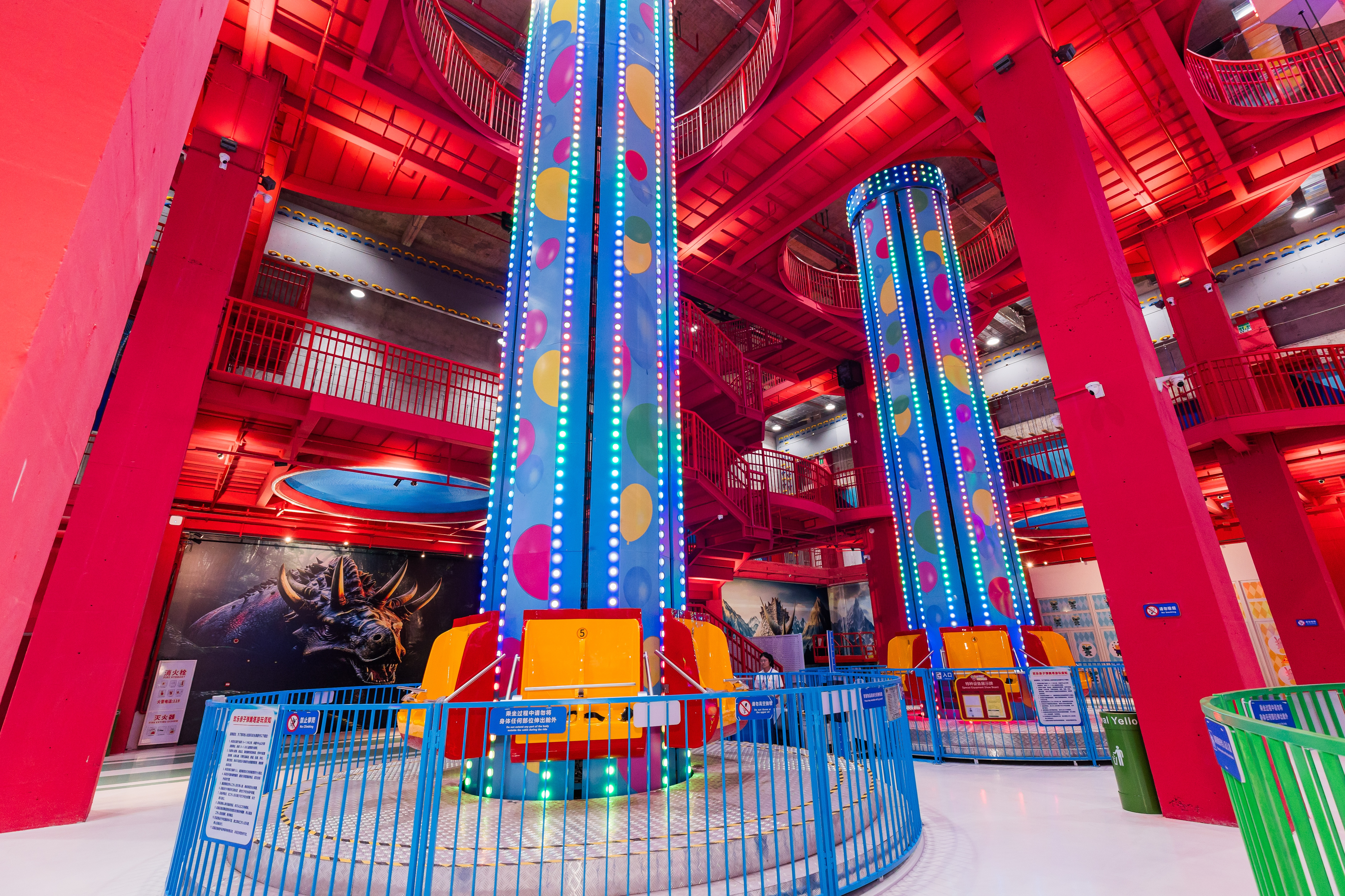 一樓: 一進大門LED瀑布大屏迎面而來,大堂設計以蘋果綠撞色拱頂,配斑馬紋地面相當搶鏡。 東區3000平方兒童樂園亮點無數,親子溜娃不二之選。 西區紅色森林主題,高空冒險挑戰樂園是年輕人挑戰小心臟的愛玩榜,配有輕餐休憩區