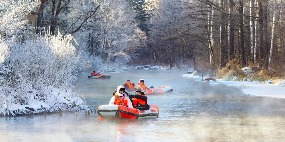 鴨綠江魔界霧松漂流以其獨特的霧凇景觀和漂流體驗而聞名。這裡的漂流體驗不同於其他傳統漂流,其特色在於落差小、水流緩,遊客可以慢慢欣賞兩岸的美景,體驗「人在畫中遊」的意境。魔界漂流的優勢在於其冬季特有的霧凇現象,霧凇是霧氣和水氣遇冷凝華在枝葉上的冰晶,為遊客提供了一個與自然親密接觸的機會。漂流過程中,河水清澈見底,時急時緩,遊客可以在享受漂流激情與刺激的同時,欣賞到獨特的霧凇美景。漂流提供了一種別樣的體驗,讓人彷彿置身於一個遠古神奇的魔幻世界中,感受著冰雪的魅力。魔界漂流不僅是一個漂流項目,它還提供了一個觀賞霧凇的理想地點。在冬季,特別是氣溫低於零下20攝氏度時,這裡會出現霧凇和冰掛,霧氣繚繞,形成一幅魔幻畫面。遊客在這裡可以體驗到冰雪世界的美麗和漂流的樂趣,是一個適合冬季旅遊的好去處。