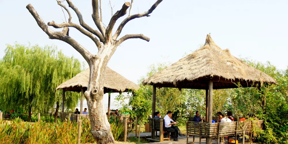 西咀濕地佔地300多畝,植被種類多樣、生態環境良好,沿湖湖濱棧道可觀湖景、賞荷花,花卉種植區春季可觀油菜花、秋季可觀向日葵,美輪美奐。