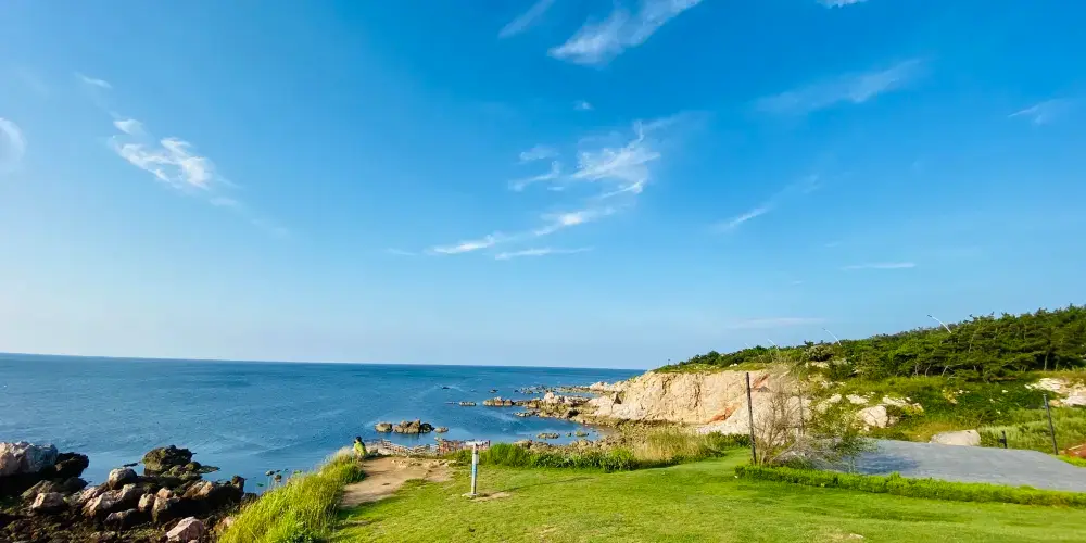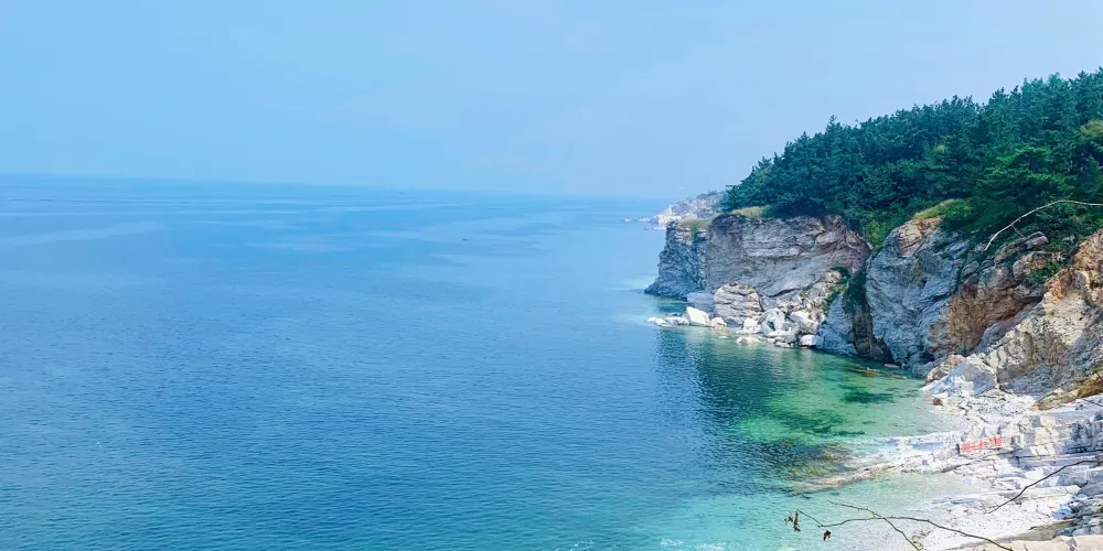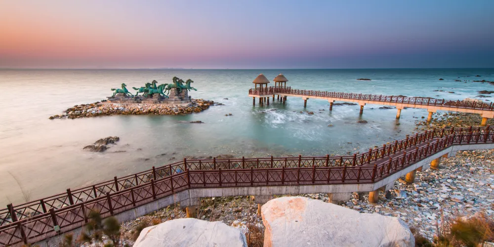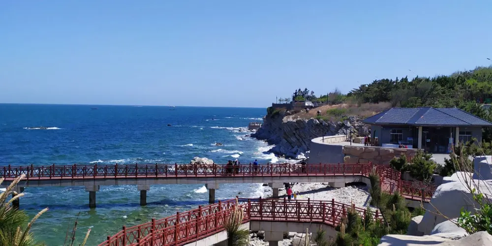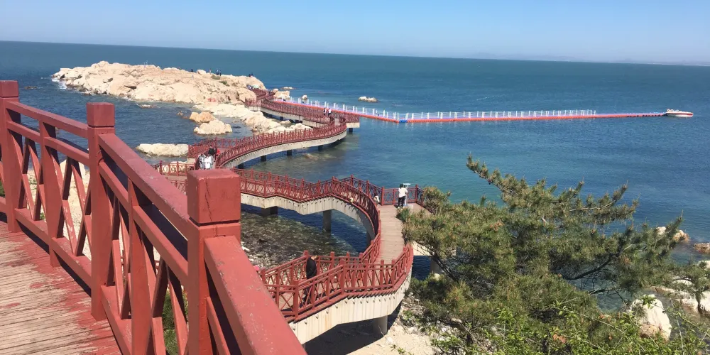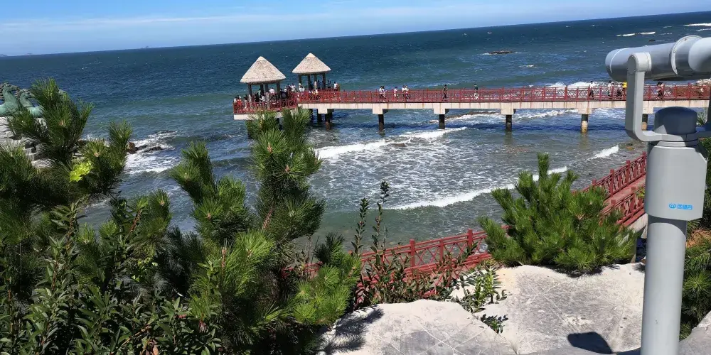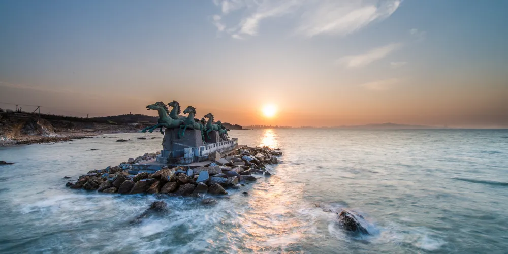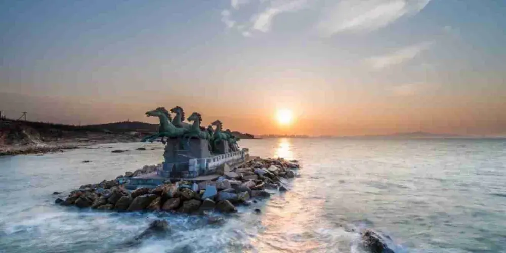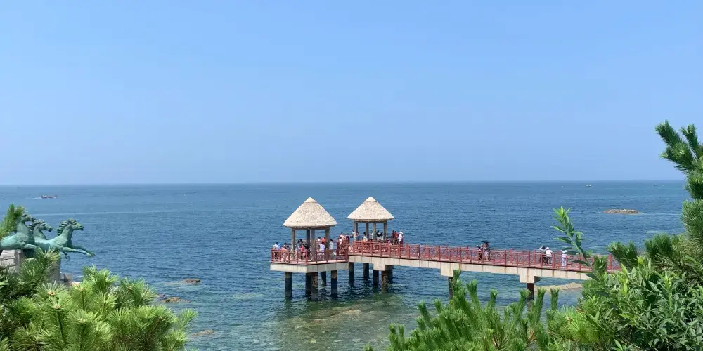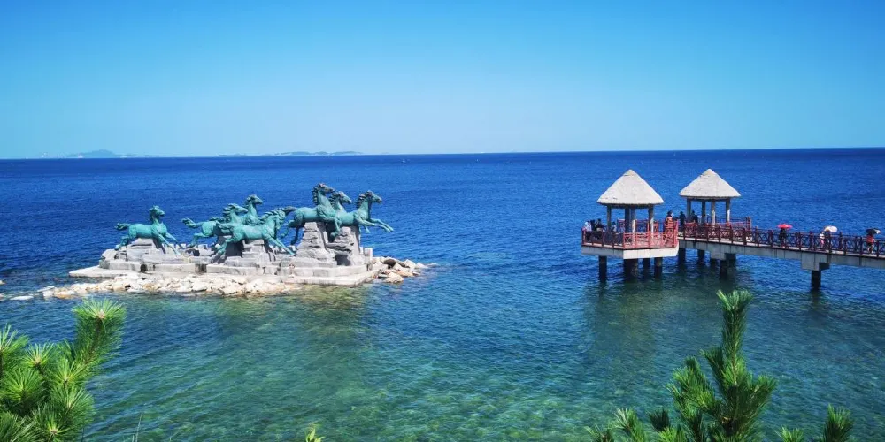 則評價秦風崖位於養馬島內,有養馬島標誌性的雕像,七匹奔騰着的馬,還有一條筆直的木棧道通往兩個海上的亭子。