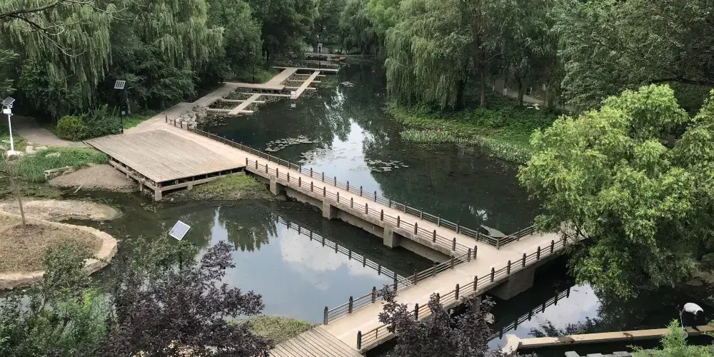 萬泉湖為濟南七十二名泉之一,湖內羣泉密佈,以泉水自然噴湧成湖而著稱。湖面煙波蕩漾,清澈如鏡。泉水明凈至潔,纖塵不留,是北方獨具特色的泉水景觀。整個湖面被龍門橋和合璧橋分為三大部分,龍門橋南面為南湖,北面為北湖,北湖與合璧橋相連,合璧東面為東湖。在萬泉湖岸邊,建有漪漪亭、濯纓亭、曲橋等小品建築,為整個萬泉湖增添無限生機。