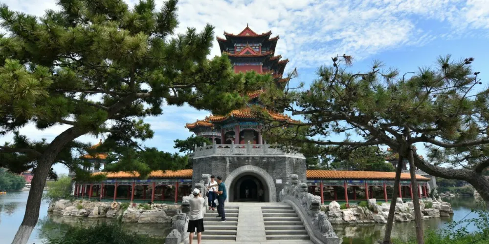 進入景區先來到和氣大殿,殿中供奉孔子、老子、釋迦牟尼像,其中釋迦牟尼佛像是用緬甸水白玉精雕而成,孔子像、老子像分別用紫銅鍍金彩繪而成,神態莊嚴。接著參觀園中的主體建築蓬萊仙島、方壺勝境、瀛洲仙境,均是建造在人工湖之中的巍峨建築,登上高閣可俯瞰園內全景。
