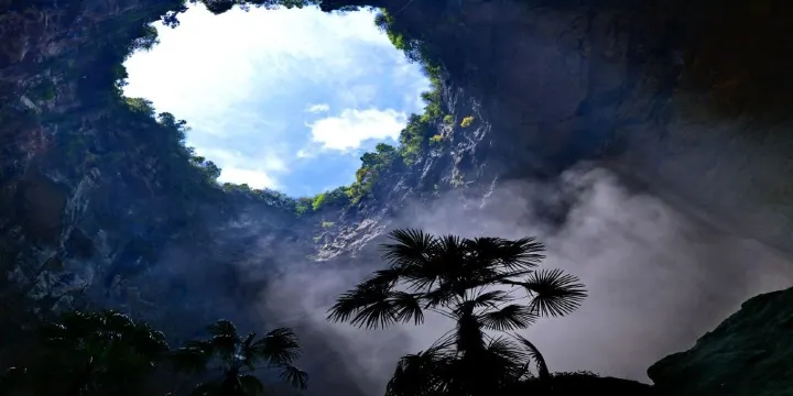 矅天眼天坑是目前世界已發現的天坑中少有的珍品。天坑深達290米,上口面積約10670平方米,底部面積約58030平方米。雨過天晴從洞口射入的陽光與坑內20多條從天而降的瀑布交相輝映,形成多條絢麗耀眼的彩虹,蔚為壯觀。坑內花草芬芳,藤蔓、苔蘚、棕樹、七葉一枝花等數十種植物交錯生長;白頭蝰、蛇、石蛙,蝸牛等多類物種繁衍生息。獨特地貌和適宜氣候造就了獨有的生態系統,使之成為一處寧靜和諧的“動植物王國”。