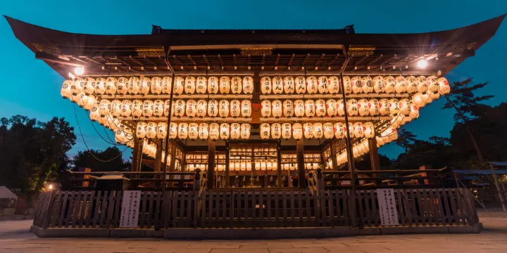 八坂神社位於東山風景區內,是日本全國約三千座八坂神社之總本社,愛稱是祇園さん。神社內有一座相當獨特的美御前神社,可以向掌管美貌的神祈福。神社的例行祭祀活動叫袛園祭,與東京的神田祭,大阪的天神祭並稱為日本的三大祭。春天,這裡也會舉辦夜櫻會。