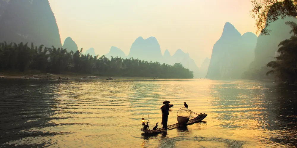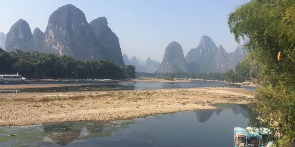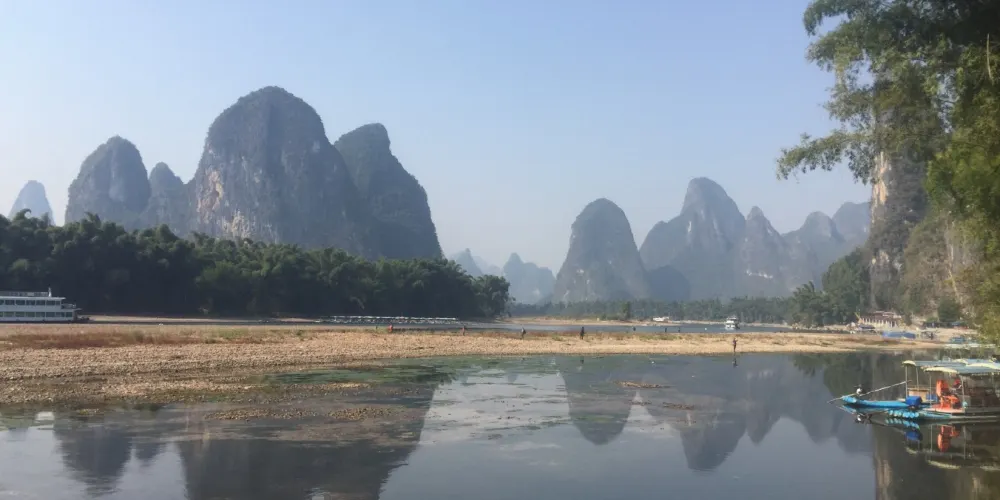 登上相公山舉目遠眺,一座座如石筍般聳立的山峰盡收眼底,清澈的漓江在群峰中蜿蜒流淌,形成一個大大的彎鉤,在晨霧繚繞中,如同水墨畫中清亮的神來一筆!