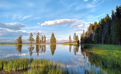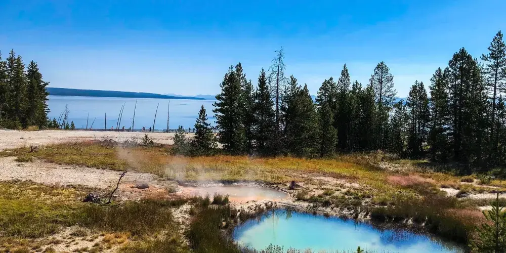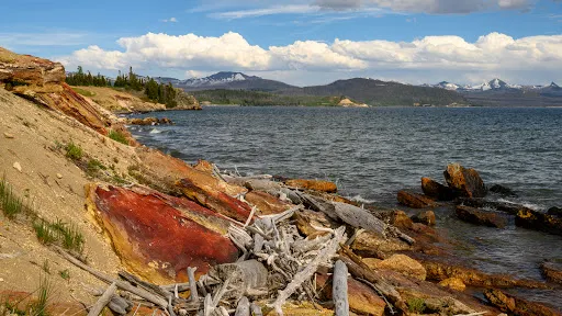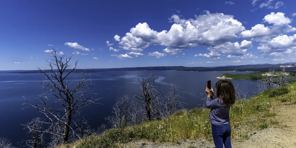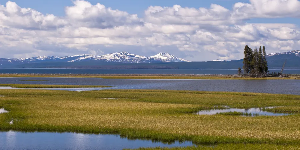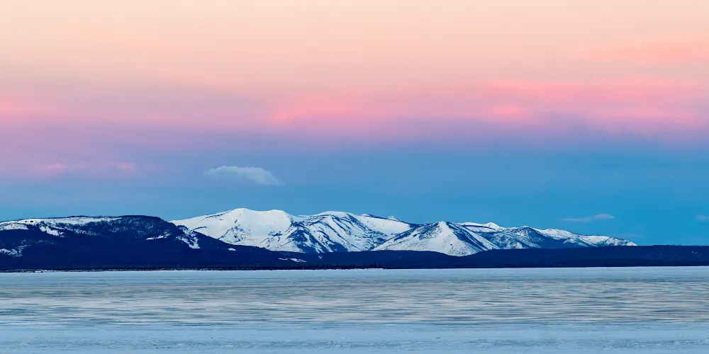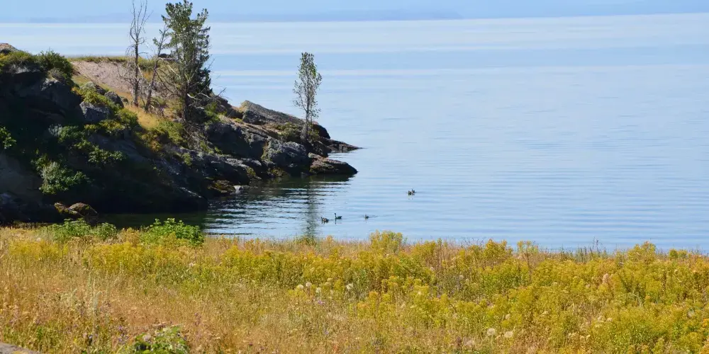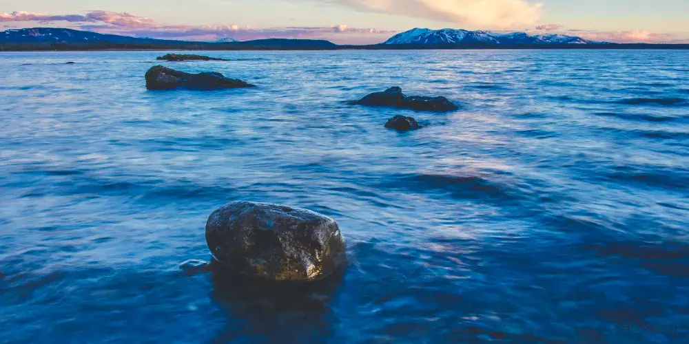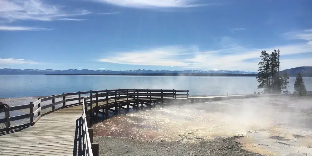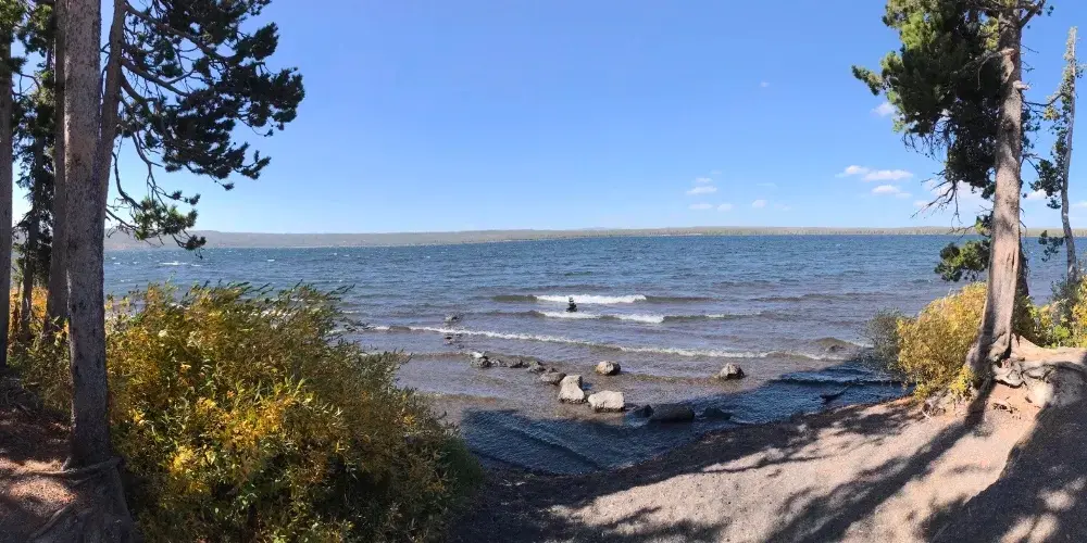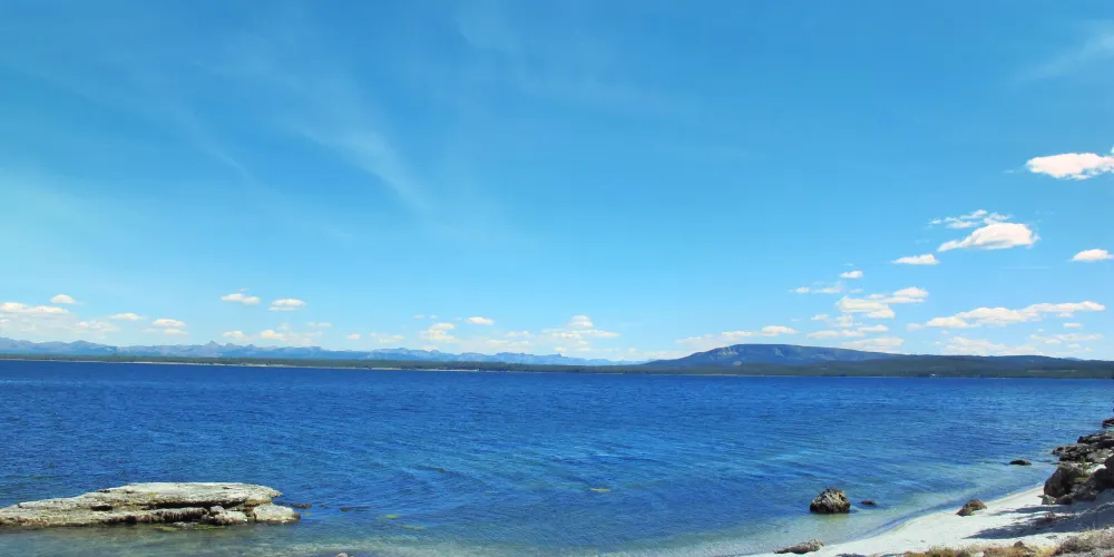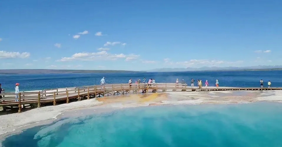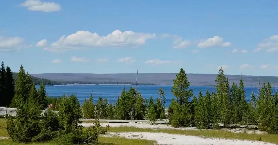 典型的火口湖,湖面如同大海般開闊,總面積約354k㎡,是“美國最大的高山湖泊”。湖水清澈透明,湖光山色,極其秀麗。黃石湖周圍長滿樅樹和真樅等寒帶常青樹,是眾多鳥類和野生動物的棲息地,也是喜歡釣魚和划船者的很贊場所。冬天的時候,黃石湖面結冰並覆蓋積雪,與遠處的雪山遙相呼應,十分壯觀。