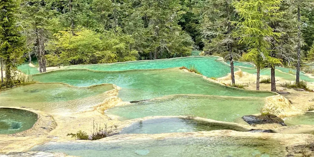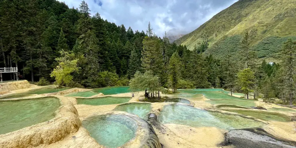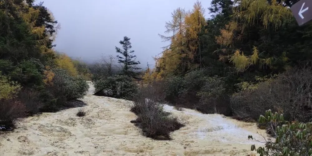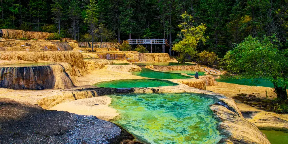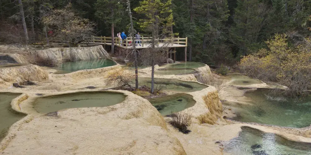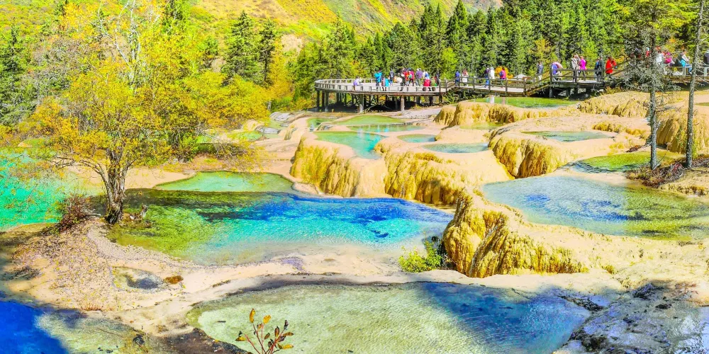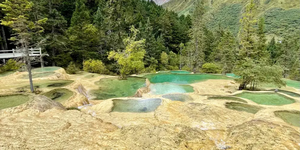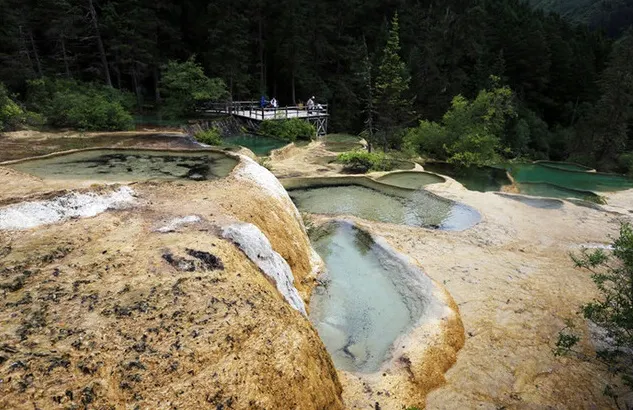 金沙鋪地位於四川黃龍國家地質公園內,以其獨特的鈣華地形而聞名。這裡的鈣華灘流經山谷,形成金黃色的階梯狀地表,宛如鋪展的金色地毯,令人嘆為觀止。鈣華地形是由碳酸鈣沉積而成,經過長年累月的水流侵蝕和沈積,形成了這奇特的自然景觀。遊客可以沿著木棧道漫步,近距離欣賞這自然奇觀,感受大自然的鬼斧神工。
