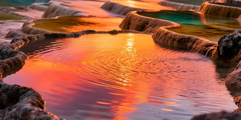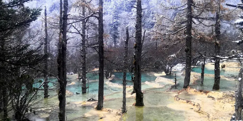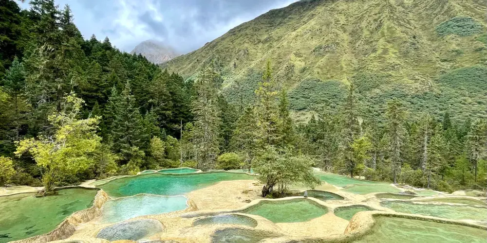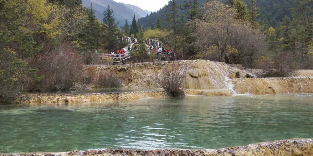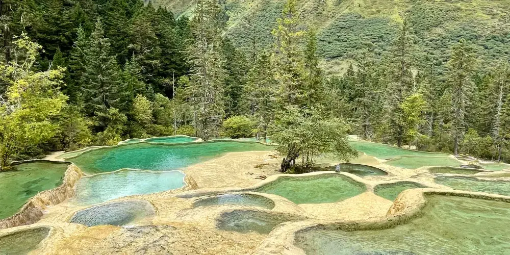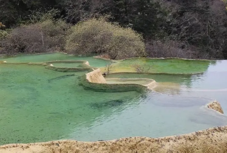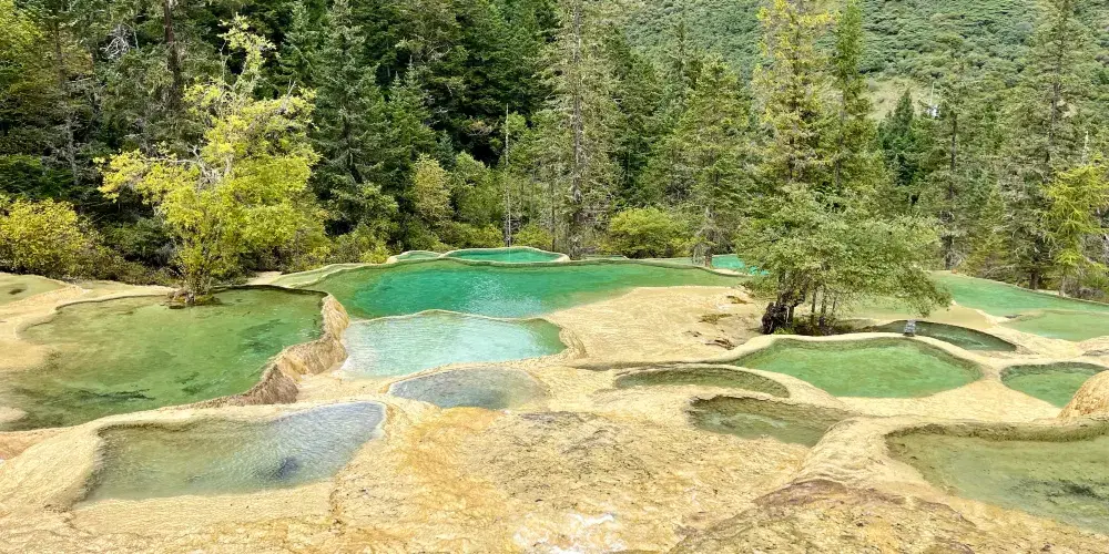 金沙鋪地位於四川黃龍國家地質公園內,以其獨特的鈣華地形而聞名。這裡的鈣華灘流經山谷,形成金黃色的階梯狀地表,宛如鋪展的金色地毯,令人嘆為觀止。鈣華地形是由碳酸鈣沉積而成,經過長年累月的水流侵蝕和沈積,形成了這奇特的自然景觀。遊客可以沿著木棧道漫步,近距離欣賞這自然奇觀,感受大自然的鬼斧神工。