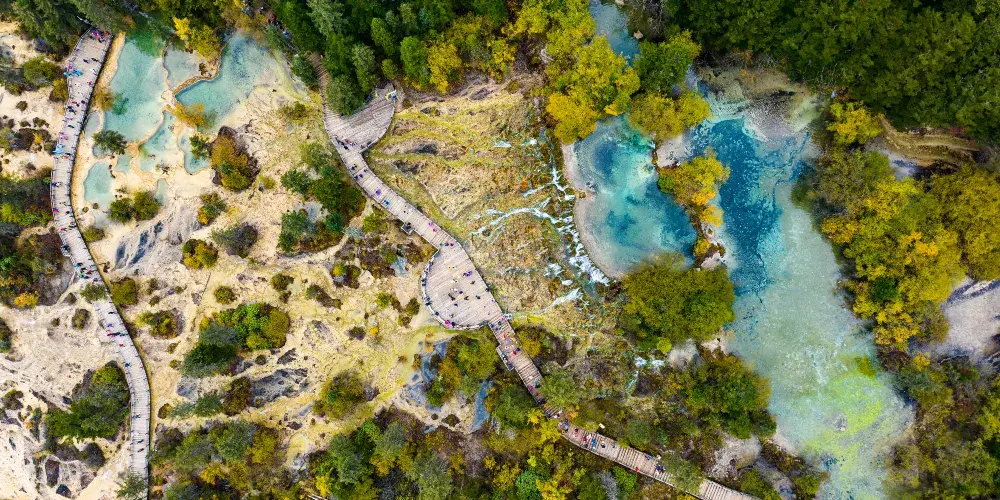推薦的遊覽時間為春季秋季節,此時氣候宜人,景色特別迷人。建議遊客穿著舒適的步行鞋,以便在棧道上行走。從黃龍景區入口出發,步行約1至2小時即可抵達金沙鋪地,沿途風景如畫,值得細細品味。景區內設有指示牌,方便遊客導航。為了保護自然環境,請勿隨意丟棄垃圾,保持景區的清潔和美麗。