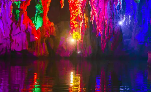 除了漫步遊走,也可以乘船穿梭在峭壁之間,穿過五光十色的溶洞,看形態各異的鐘乳石,感受大自然的造物奇蹟,也更添一份世外桃源般的雅緻。