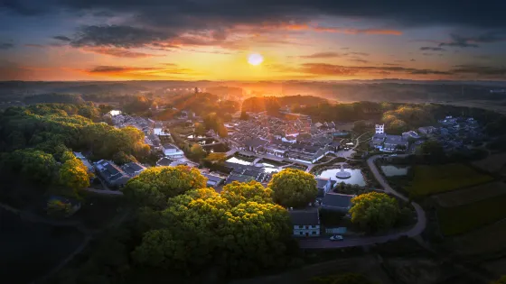 釣源古村位於江西省吉安市西部,至興橋鎮往北,古樟成林,茂密蔥蘢,綠葉掩映下,青磚黑瓦若隱若現。村里長幼婦孺,怡然自樂。一條條青石板鋪就的巷道,曲折迂迴伸向各幢古宅。從平整、光潔的青石板上走去,只見老屋高低錯落,排列有序,顯得幽得與蒼老,引人入勝。風姿各異的曆代建築,如一幅幅淡淡的民俗風情畫,令人賞心悅目。建築風格的豐富多樣,隱含太極八卦的結構布局,形成了釣源古村群落的顯著特色。