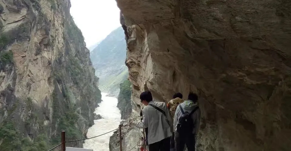 一線天是虎跳峽徒步後半段必經的地方,這一段路非常險峻,是沿着峭壁開鑿出來的驛道,古代茶馬古道的馬幫就是從這樣險峻的路上通過。
