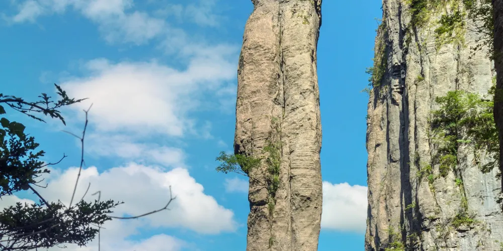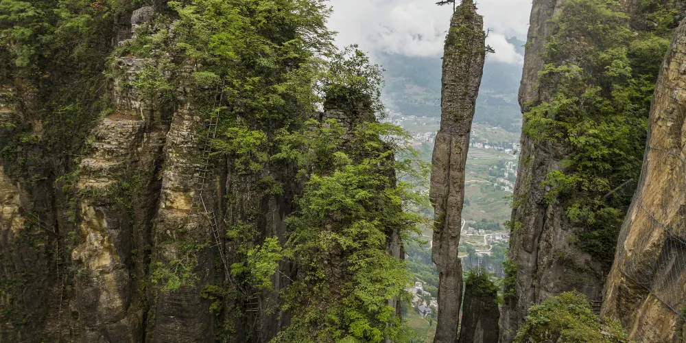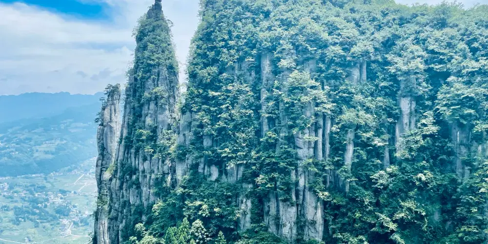 絕壁棧道,又稱步雲天棧、絕壁長廊:始建於 2006年8月,歷時1年又8個月建成。棧道位於山體東側的直立懸崖絶壁山腰,海拔約1700餘米,全長488米、高差達300米、石階118個,與山巖絕壁融於一體。因該棧道建於絕壁之上,所以也有人稱之為絕壁長廊,或“絕壁棧道”該工程是巴蜀古棧道製造技術與現代鋼筋砼建材、先進施工工藝的結合,科學安全,大氣壯觀。