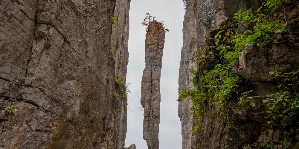 喀斯特石柱。一炷香為恩施大峽谷標誌性景觀,也是同類喀斯特地貌中,十分稀有的景觀。一炷香高為150米,柱體底部直徑6米,最小直徑衹有4米,其巖性為三疊系灰巖。因此處地層為水平產狀,加之巖石的抗壓強度大(為800千克/立方厘米),無傾斜滑移,故風吹他不動,雨打他不倒,傲立羣峯之中千萬年,守護着這片神祕的土地,實屬罕有。