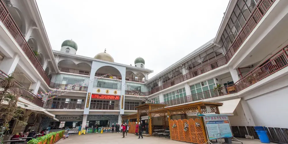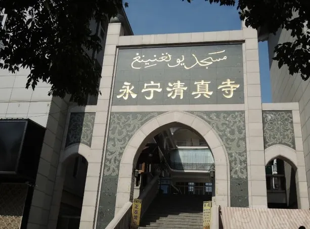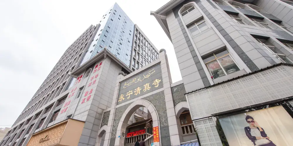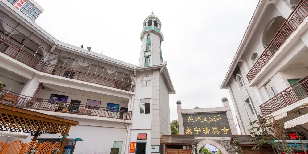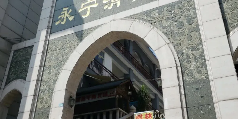 原址在東來街“魚市”,故又稱“東來街清真寺”,元末毀於戰火。明永曆年間(1647-1661)重建,改名為“永寧清真寺”。現存永寧清真寺是清光緒二十四年(1898)所重建。布局為四合院,朝北開有一山字形門樓,門內有軒敞的天井。禮拜殿為歇山頂純木結構,碧綠色琉璃瓦履蓋屋面。殿門正中懸有“朝真殿”木匾。闊4間,深2進,穿鬥式梁架。殿內面積約200餘平方米。殿前有卷棚式敞廊,兩側牆面繪有麥加朝覲圖。殿對面有廂房7間,為參加聚禮者休憩之所。殿側有教室1座,議事室1廳。浴室設於議事室之後。該寺規模雖小於永曆年間所建,但經堂教育一直興盛,雲南各地清真寺的阿訇、掌教多曾在此求學。