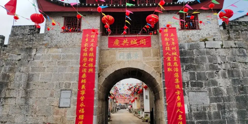 永寧州古城位於廣西桂林市永福縣百壽鎮北端,與百壽巖隔河相望。永寧州古城始建於明成化十三年(1477年),至今已經歷529年的風風雨雨。古城原先為土城,城牆周長約1000米,高5米,厚2米多。成化18年,改砌為石城;隆慶六年(1572年),古城往西被擴寬80餘米,建城門四座,東門叫“東興門”,南門稱“鎮寧門”,西門喊“安定門”,北門為“迎恩門”。至萬曆三年,城牆加高到1.3米,加厚到0.6米;萬曆八年(1580年),古城往北又擴展100米,城周長擴建為1277米,高6.33米,厚3.2米,城頭垛637個,窩鋪12個,兵馬司4處,並在四座城門之上建起門樓。萬曆十四年(1586年),在古城東面築護城河堤430餘米,城牆再次加厚,並加女牆窩鋪。