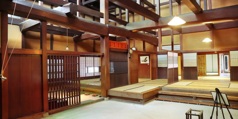 _x0008_這棟建築建成於明治41年(1908年)。它曾經是酒坊,因此至今房簷下還懸掛著大酒幌。_x0008_建築物內部通過以頂樑柱為中心由多根橫樑與垂柱構成的通風天井,光線由高窗灑向屋內,使房柱與壁板的木紋之美盡現,體現了當時日本建築的水平。