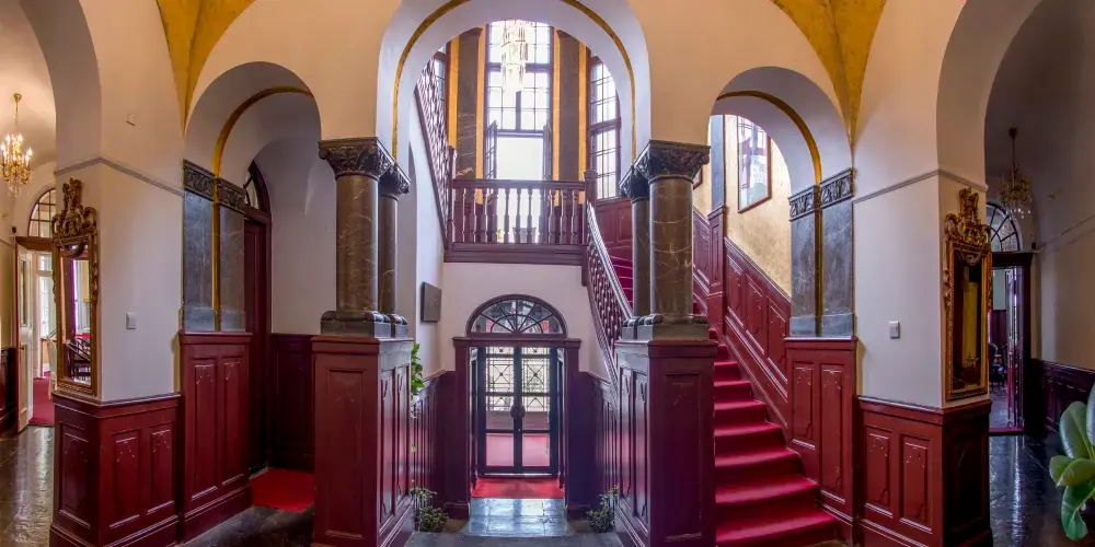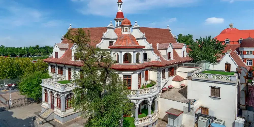袁氏宅邸先後委託英、德工程師設計師設計,為一座歐洲古典式建築。高三層,磚木結構,共有房54間,建築面積2089平方米。這所樓房設計特點是:有所謂“隱身處”與“脫身處”。“隱身處”是在二樓右側有個小門,門內建鋼筋混凝土樓梯,鐵欄杆,可上至樓頂間,下至地下室、如果關上小門便找不到上下樓的去處。“脫身處”是在三樓涼亭 設有鐵樓梯,直通後花園餘門,由此可脫身逃走。此外,在這所樓的二、三層之間還專門設計了一間八角形房屋,幾面窗戶都朝海河,無論潮漲潮落,河水都好似往 八角樓裡流,象徵無數財源流人袁家。