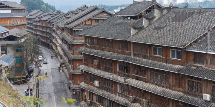 月亮街北起古宜大橋東側,南至三江風雨橋,工程總長兩千米,其中步行街三百米,設有五個下江碼頭和全程臨江防洪堤,沿街建有57座侗族吊腳樓以及道路、碼頭、碑廊等配套設施,項目總投資4800萬元。吊腳樓羣、青石板路、侗族歷史文化碑廊等延伸在月亮街上。是一條集旅遊、商貿、居住、休閑、餐飲服務等為一體的綜合街,也是侗族傳統建造技法發展與現代化城市建設技術相結合的新成果。