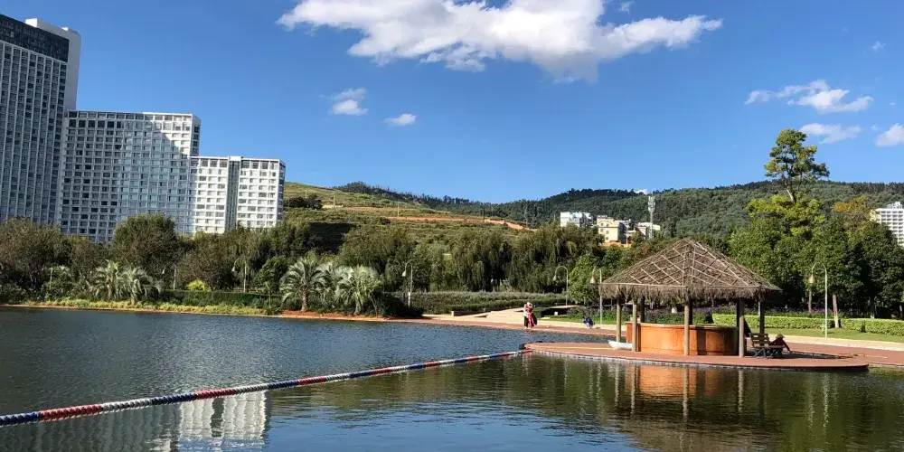 月亮灣濕地公園與撫仙湖悅椿度假酒店相鄰,與撫仙湖零距離,適宜散步觀景。南側湖畔有一片開闊的椰林樹影沙灘,彷彿置身於真正的陽光海岸。月亮灣濕地公園現有的景點有:城河月亮灣中游濕地生態長廊、麗景生態園和城河大豆文化展示園等。