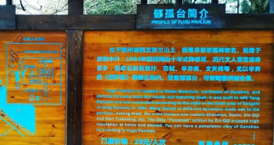 鬱孤台建在贛州市區北部的賀蘭山頂,以山勢高大而得名,為省級重點風景名勝區。鬱孤台的始建年代久遠已經無法考證,唐代時虔州刺史李勉曾登台北望,將台更名為“望闕”。後幾經興廢,仍名鬱孤台。 1983年按清代同治年式樣重建,遊人登上鬱孤台,可遠眺市區全景。
