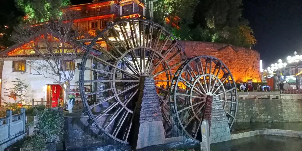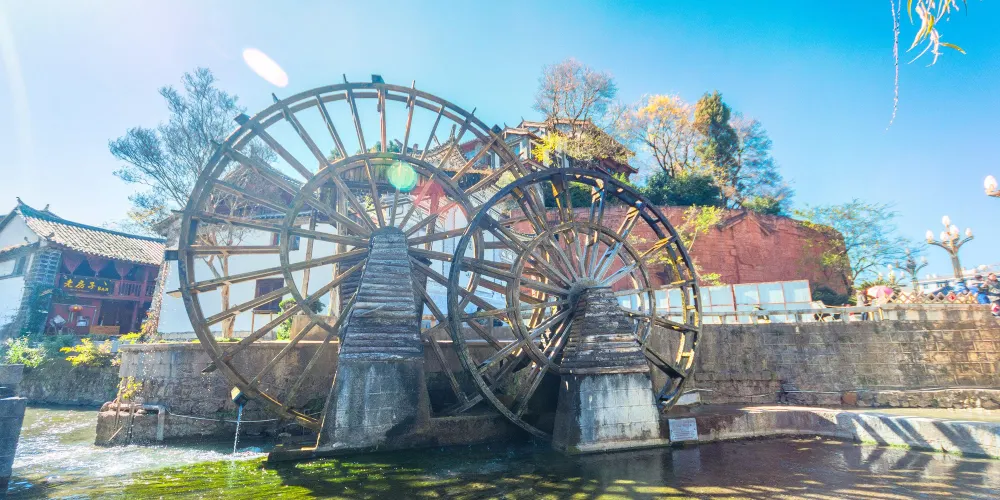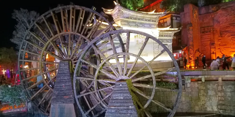 則評價古城大水車位於麗江古城口,一進古城,首先看到的是兩座水車,有人說它是子母水車,也有人說它是情人水車。照壁加上水車的形象,幾乎出現在麗江古城所有的對外宣傳照中,大水車往右便是寫有江澤民主席題詞的照壁,照壁用的是城內民居的建築形式,非常特別。