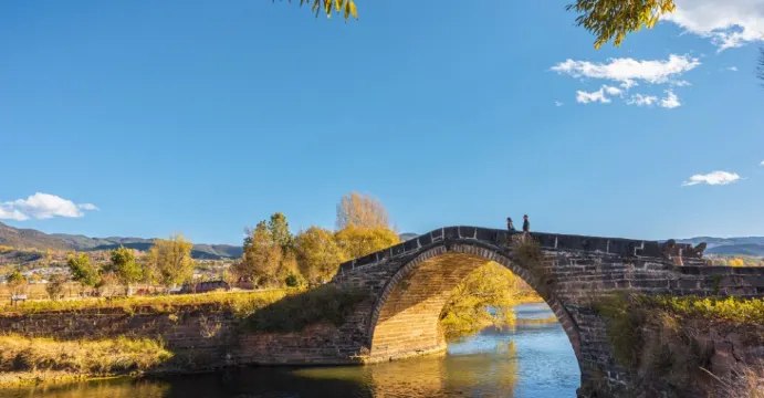 玉津橋始建於清朝康熙年間,幾百年來幾經坍塌和戰火的破壞,於1931年,雲南省大理州劍川縣沙溪民眾募資再建古橋,白族著名學者趙藩為玉津橋的重修專門撰寫了《修橋募引》。玉津橋跨空12米,高6米,橋長35.4米,寬5米,石柱石板護欄。拱頂上有石雕鼈頭,雄視黑惠江上游,另一側是石雕鼈尾連接黑湛江下游,護欄盡頭有四衹“娃娃魚”石雕。古橋是世代居住在沙溪的白族人通往田間地頭勞作經商的必經之路,橋身的石板被過往車馬和行人踩踏得泛着青光,坑坑窪窪。古橋承載着沙溪古鎮厚重的歷史,年復一年地迎來送往沙溪幾代先民。