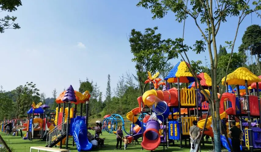 森林樂園有月牙灣水世界、草原部落、農耕研學、萌寵奇遇、夢幻劇場、梅花鹿餐廳、九曲花海、歡樂草坪、森林祕境等項目,結合農旅配套於一體。讓孩子們在遊樂的同時從更多元化的角度認識世界,在自然森野間,打開親子之間的心靈之門,陪孩子健康快樂的成長。