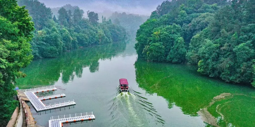 朝陽湖生態旅遊區:水上青城間·山湖白鷺棲。朝陽湖長7.5公里,2條水道、4島、28彎、108峯。這裏遠離塵世,景色秀麗,優雅寧靜,以湖泊山巒為主景,以原始自然風貌為特點,自然景觀和原始景觀相生並長,有“水上青城”的美譽。在進入度假區入口後,先到達的區域便是擁有80平方公里水域面積的朝陽湖生態旅遊區。乘船而上,置身感受朝陽湖的優雅寧靜。