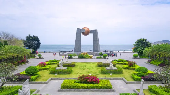 乘船抵達島上後,可以在渡口直接乘坐環島巴士,終點就是該景區。景區的灣口朝向東南,灣腹很深,灣弧達2.9公里,登高俯視,就像一彎新月,成排成片的木麻黃樹循著弧形沙灘蔓延開去。海浪、白沙、林帶以及林中新築的各式亭台樓閣,構成了海灘邊美好的景象。