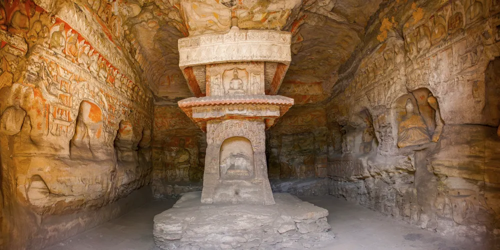 第九窟窟門為仿中國傳統廡殿式建築,兩側對稱布龕,中西合璧,具有濃厚的裝飾意味。窟內四壁分層布龕,造像題材多出自《法華經》。窟頂格狀,格內雕團蓮及飛天,八夜叉體魄健碩,力舉萬鈞,單手承托橫枋。後室北壁主像雕釋迦,東西兩壁各一脅侍菩薩。
