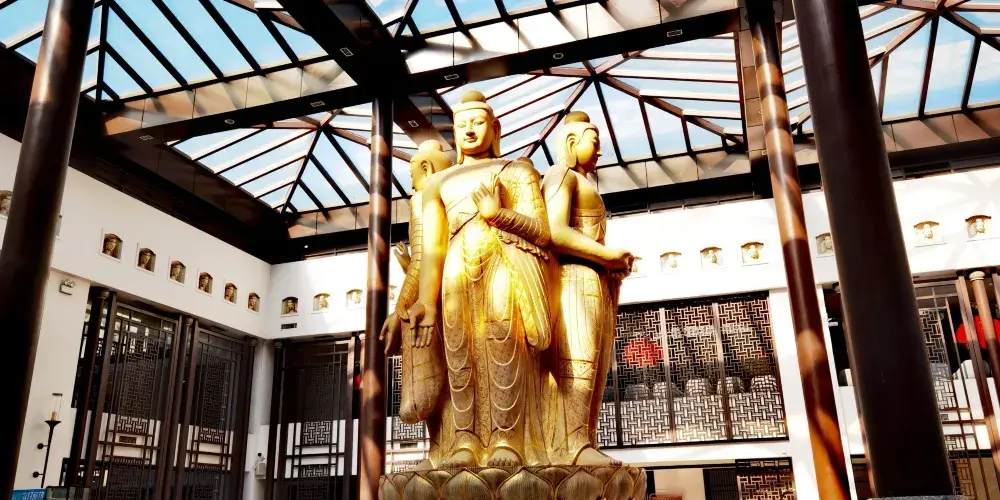 雲岡石窟-靈巖寺坐落於雲岡石窟景區的湖心島中央,進入景區大門後,走過曇曜廣場,穿越古樸典雅的七孔橋,寺院山門就出現在面前。雲岡石窟-靈巖寺的三座大殿的主佛像,全部採用巨大的香樟木作材料,由來自福建省莆田的木雕世家傳人黃文壽大師擔綱雕刻。其中,山門內的主佛為3尊,中間為交腳彌勒菩薩,兩側為護法;千佛殿的主佛為7尊,中間為釋迦牟尼佛,左右還有燃燈佛、多寶佛、觀世音、大勢至菩薩等;大雄寶殿主像過去、現在、未來三世佛。寺院周圍的四座角樓、六座配樓,加上“一斗三公升人字拱”,更是引人入勝。