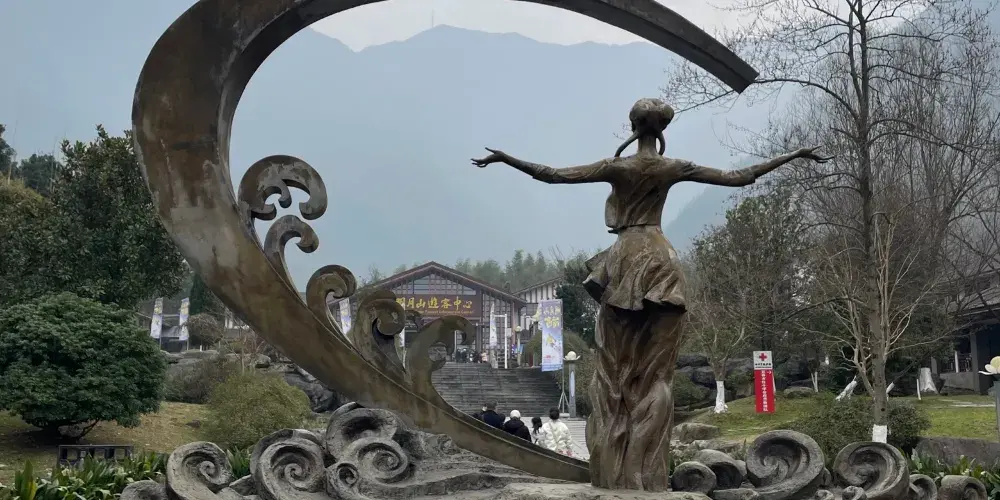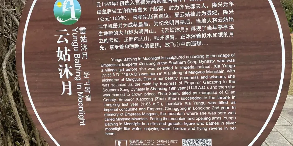 雲姑沐月是依據南宋孝宗皇后被選入宮前的村姑形象雕塑而成。夏雲姑(公元1133年-1167年),明月山夏家坊人,小名明月,天生嬌美,善良聰慧。南宋紹興19年(公元1149年)初選入宮被宋高宗皇后看中,選作貼身侍女,後由皇后做主許配給皇太子趙昚,封為齊安郡夫人,隆興元年(公元1163年),宋孝宗趙昚繼位,夏雲姑被封為賢妃,隆興二年被冊封為成恭皇后。為紀念明月皇后,當地人將雲姑出生地旁的大山稱為明月山。